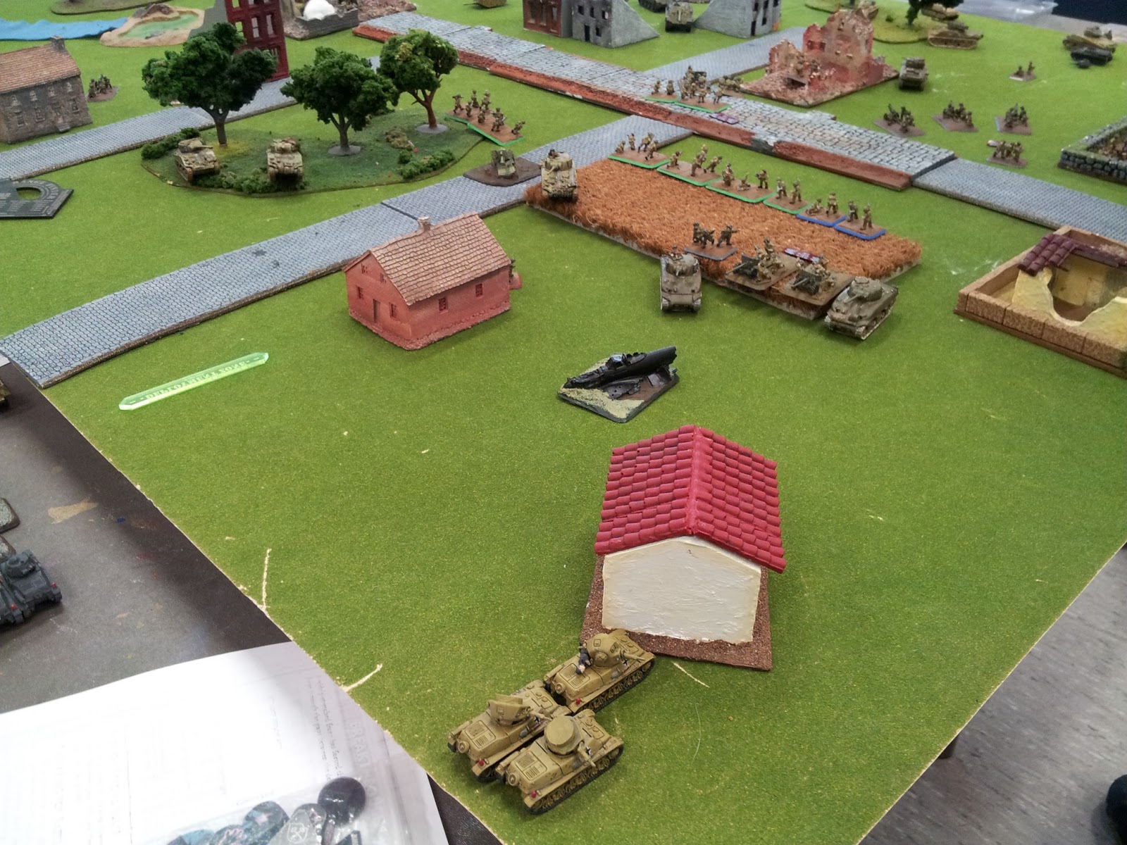 The assault guns rolled up the right, the Valentines tried to come up the middle and got shot up by the Shermans. Their one Sturmovik that didn't get intercepted wiffed on the Sherman mob in the middle killing only one. Our air didn't do much till the last turn when it hit the bunched up armoured cars and su 122s causing massive casualties and both platoons failed their morale checks and fled. Time was called at that point with no one being close to taking an objective. Our air gave us the only two platoons destroyed in the game and a score of 3-1. This was a fairly frustrating game since none of us knew the rules that well and we only got to play 3 turns.